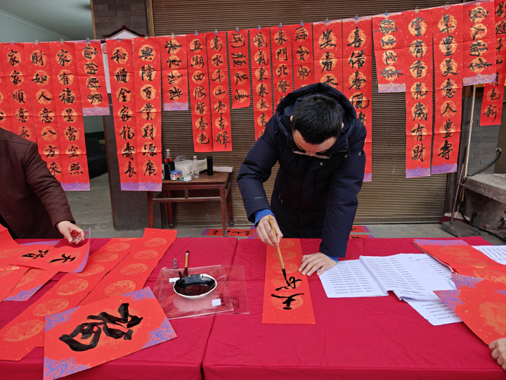 2月5日,石柱本地书法家在活动现场写春联送给游客。