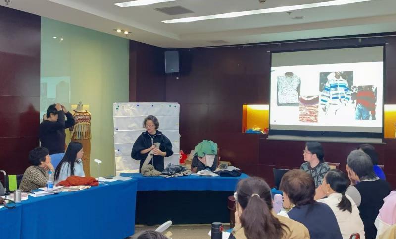 交流会上,江南布衣为本次“美丽工坊”活动组建的专业讲师团队,从工艺与设计双维度提供指导。从业40余年的毛衫版房主管戚彩琴高忆管理,详解毛衫打样、大货全流程,涵盖试片确认、尺寸测量、水洗整烫等关键环节;芝麻实验室设计师焦亚楠则围绕廓形设计、材质选择、色彩搭配等内容,分享从设计图稿到成衣落地的全链条逻辑。