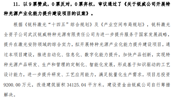 本次增资与锐威公司一项既定的能力建设项目紧密相关。2025年8月27日,锐科激光董事会已审议通过《关于锐威公司开展特种光源产业化能力提升建设项目的议案》,该项目总投资达9200万元,旨在推进自动化、信息化、数字化能力建设,以满足批量化生产需求,服务于国家发展战略。此次的9000万元增资,极大概率是为该项目的顺利实施提供直接的资金支持,旨在将技术研发优势转化为规模化生产和市场交付能力。