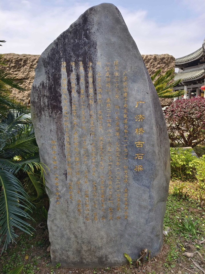 石上深刻着字:“一号古石梁”、“三号古石梁”……旁边还有小小的碑记,说明着“广济桥古石梁”的来历。