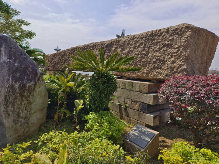 目光被路边几块粗粝的巨石吸引。它们沉默地卧在那里,与周遭雕琢过的亭阁石栏格格不入。